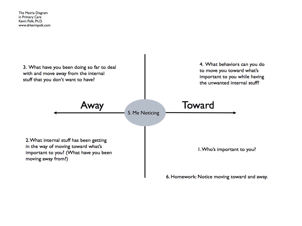 [”Acceptance and Commitment Training/Therapy (ACT) is an an evidenced-based way of helping people let go of struggling and get moving toward valued living. “Traditional” ACT is complicated and hard to learn. The ACT Matrix is easy.” Dr. Kevin Polk]