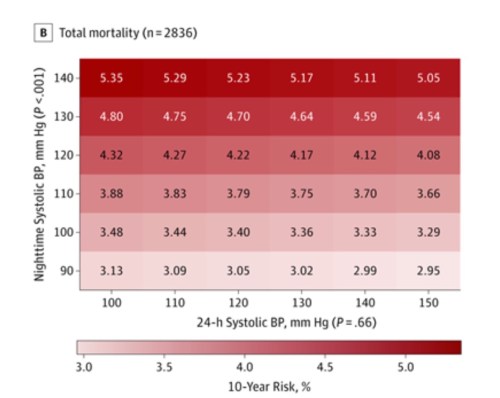 “In this population-based cohort study, higher 24-hour and nighttime BP were significantly associated with greater risks of death and a composite cardiovascular outcome, even after adjusting for other office-based or ambulatory blood pressure measurements.“