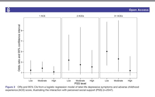 A low PSS score may increase the risk of depression five-fold for people with a history of three or more Adverse Childhood Events according to a 2017 paper in the British Medical Journal: