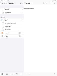 For book chapters, I paste my text into Scrivener, which synchs (although they spell it ‘syncs’) with Dropbox across devices. This is a writing program that lets you create, format and organize chapters. The last step is then to convert the whole project to a Pages, pdf or (if necessary – ugh) Word document.