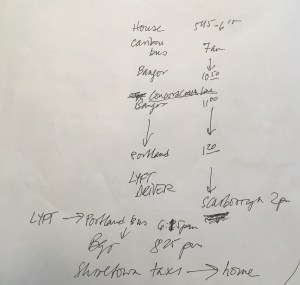 “Wait a minute”, I said. “The Cyr bus from Caribou to Bangor leaves at 7. I know that, because I have dropped people off there many times. And Cyr doesn’t have a bus from Bangor to Portland. Who is the carrier for that one? And, how did you say you’re getting from the Portland bus terminal to the doctor’s office? Do you have this schedule in writing?”