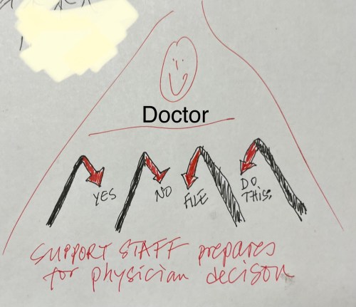 Love the paper napkin triangle; simple metaphor drawing that calls out the problem. The ‘solution’ therefore is that the support staff has access and SORTS the information. A forward thinking EMR company (oxymoron) should design this workflow solution