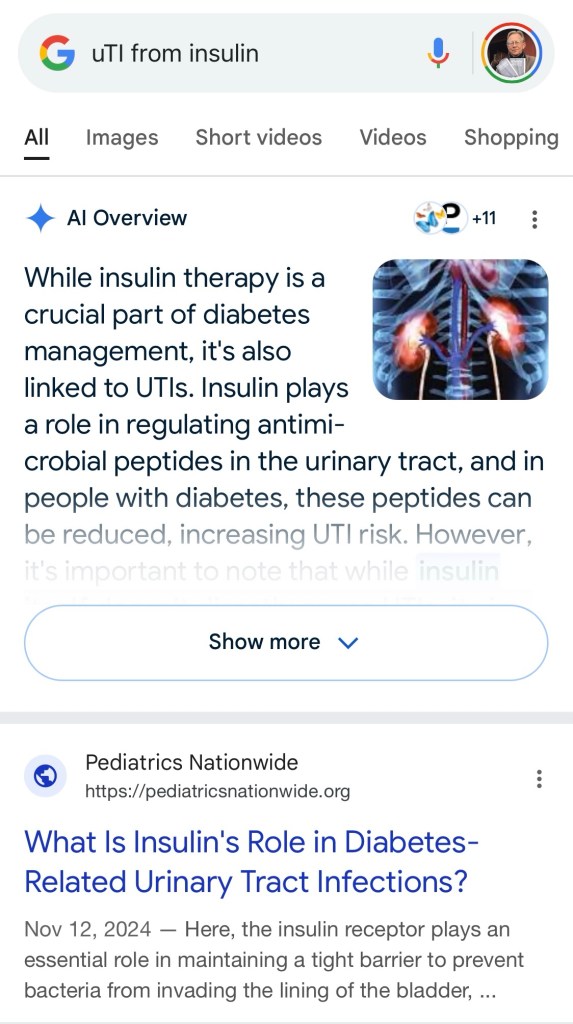 My trusted, much younger colleague, Dr. Google, quickly produced the most interesting answer to my query “UTI from insulin”.