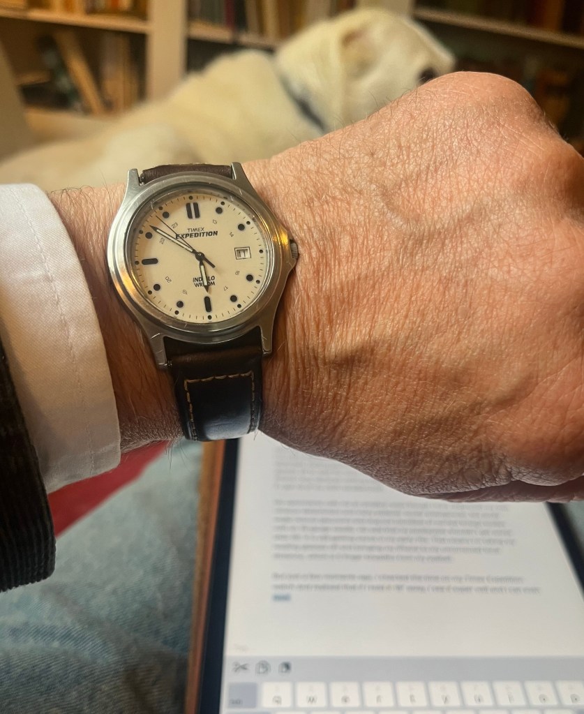 But just a few moments ago, I checked the time on my Timex Expedition watch and realized that if I hold it 18” away, I see it super well and I can even read the tiny word Timex above Expedition. So technically I can still read emails, The New York Times and all my other news sites with my old reading glasses without getting new ones. I just have this one bad habit of wanting to read up close, closer than other people.