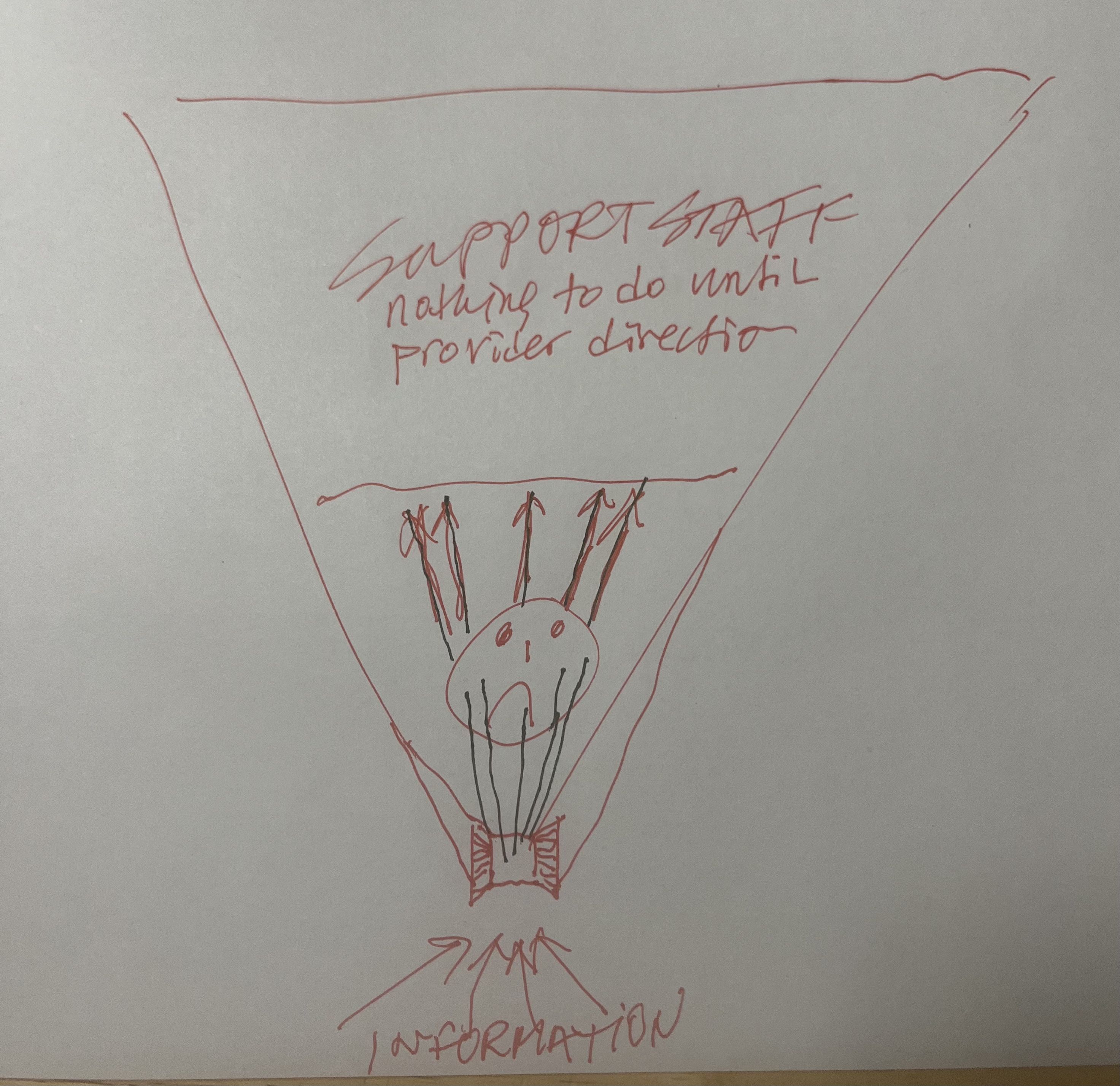 Today’s information flow triangle is upside down: Its foundation, read entry point, is the medical provider. It is the team leader who has to touch and timestamp (in the background) everything and then electronically spoon feed it to the other team members.